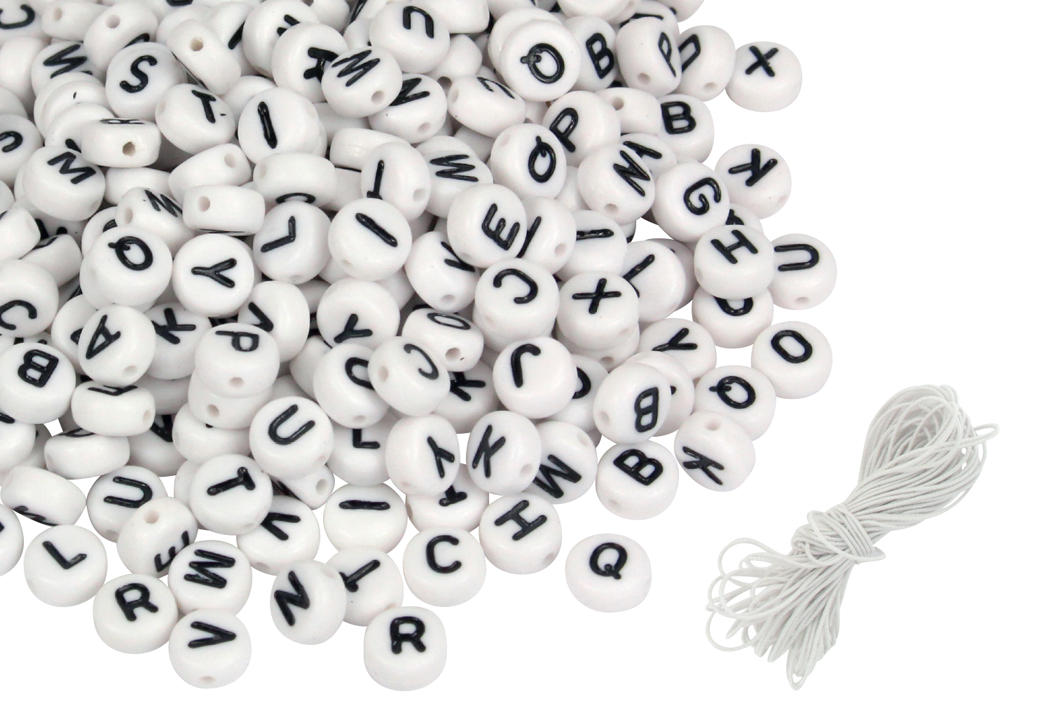 Perlas de alfabeto para creación de joyas. Letras y colores surtidos. Cada set de perlas es entregado con 5 metros de hilos elásticos blancos para fabricar collares y pulseras.
