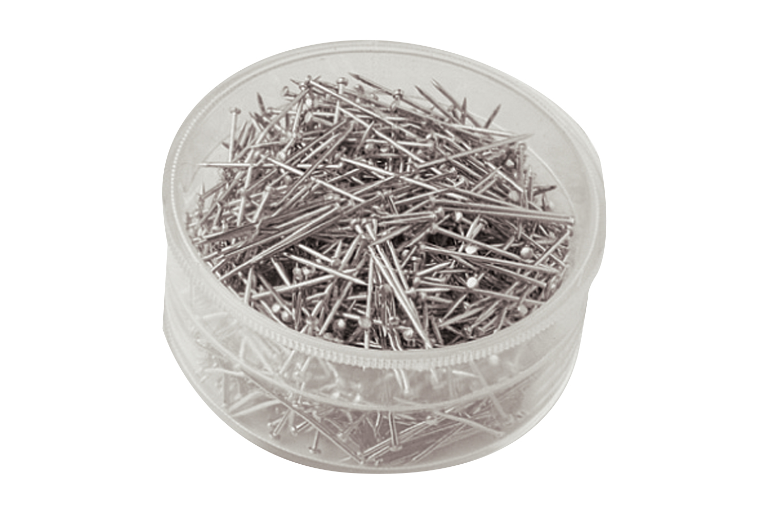 Caja de aproximadamente 600 pines con cabeza de metal para fijar lentejuelas y brillantina en poliestireno o para cualquier otro uso.