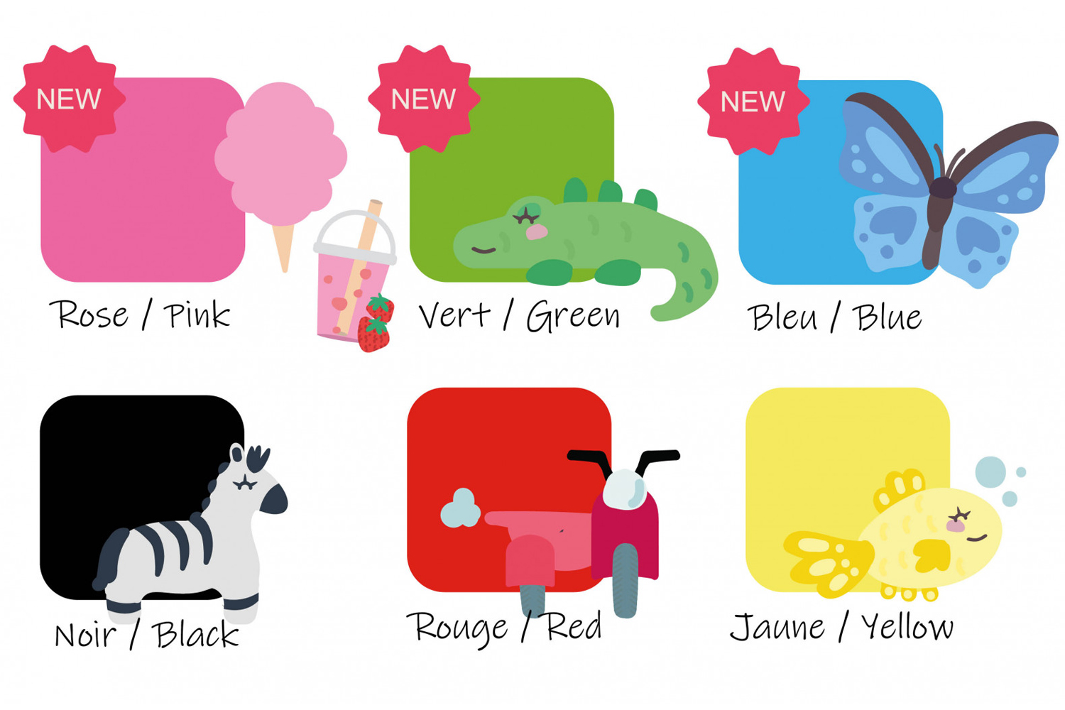 - 6 botes de 100 ml : amarillo, rosa, rojo, azul, verde y negro.