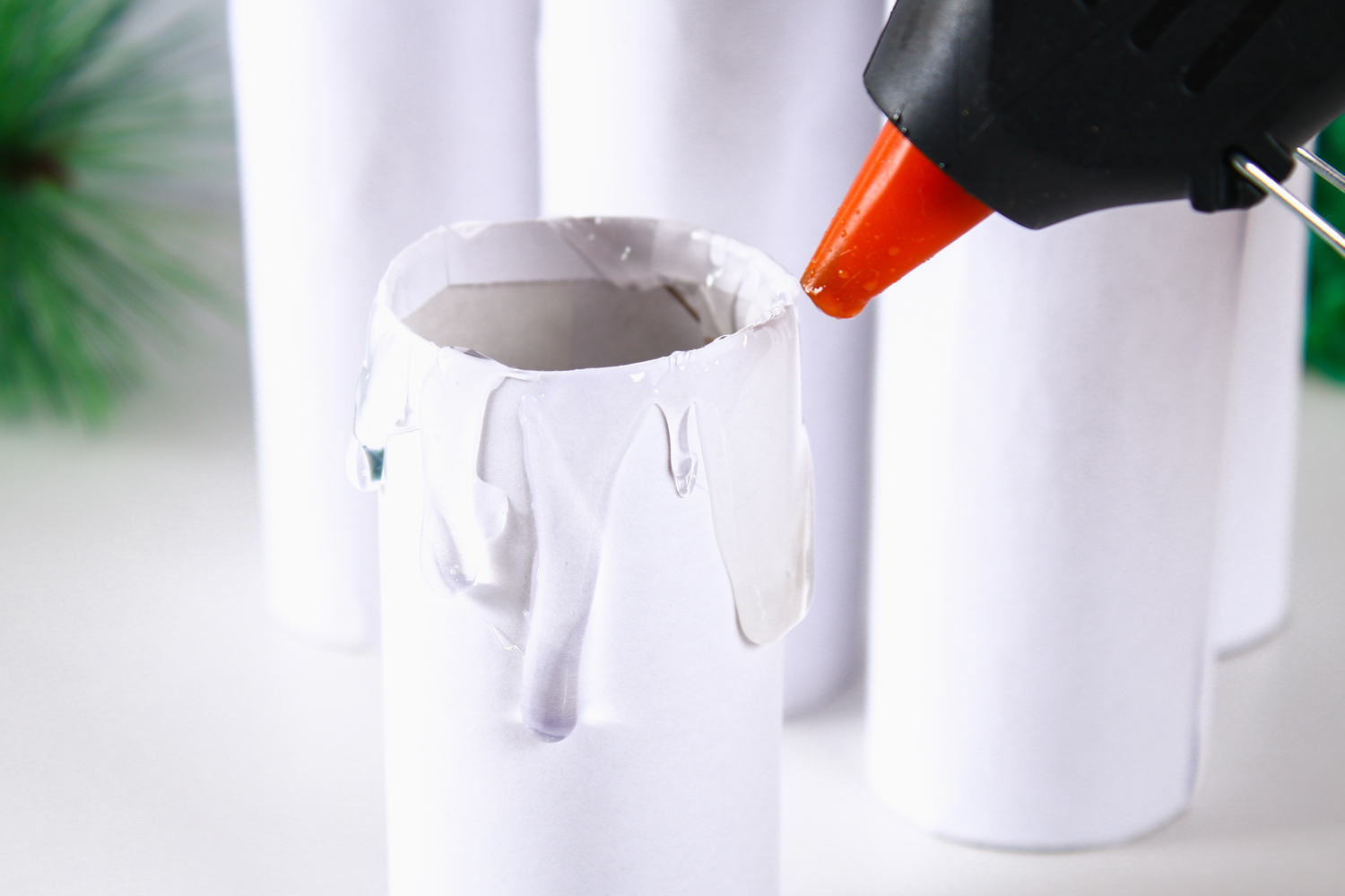 - Cargar una barra de pegamento en la parte trasera de la pistola, esperar 1 min, luego apretar el gatillo de la pistola para hacer salir el pegamento.