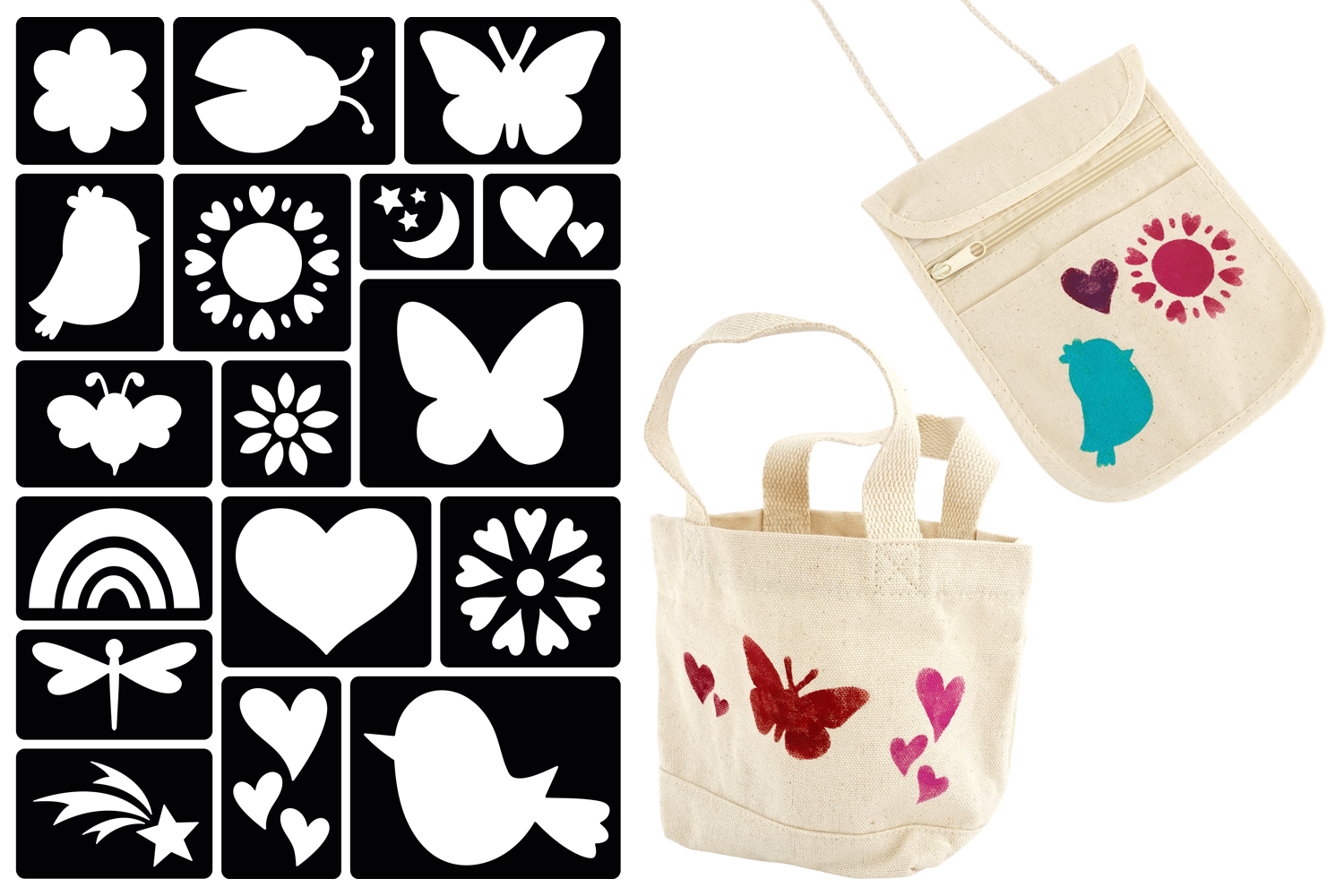 - 17 plantillas de plástico reutilizables, motivos corazones, mariposas, flores, arcoíris y otros elementos naturales.