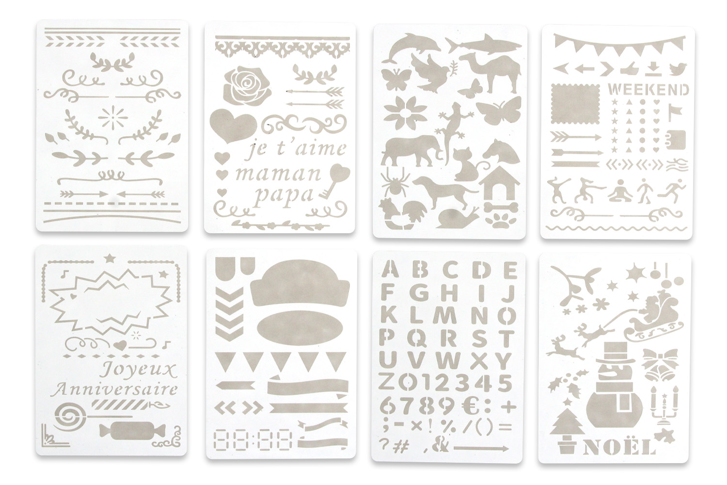 Asortimento de plantillas de plástico flexible a utilizar con bolígrafos y rotuladores para embellecer tarjetas, invitaciones y dibujos. Patrones y temas variados: animales, alfabeto, Navidad, cumpleaños, día de la madre..., para servirle todo el año y realizar hermosas tarjetas, o ilustrar su agenda. También es adecuado para la decoración textil.