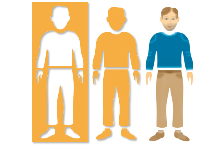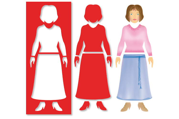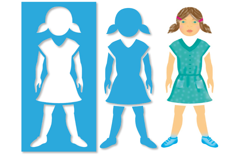 Plantillas de plástico resistente para aprender a dibujar fácilmente el cuerpo humano + las 5 siluetas de cada personaje para crear sombras.