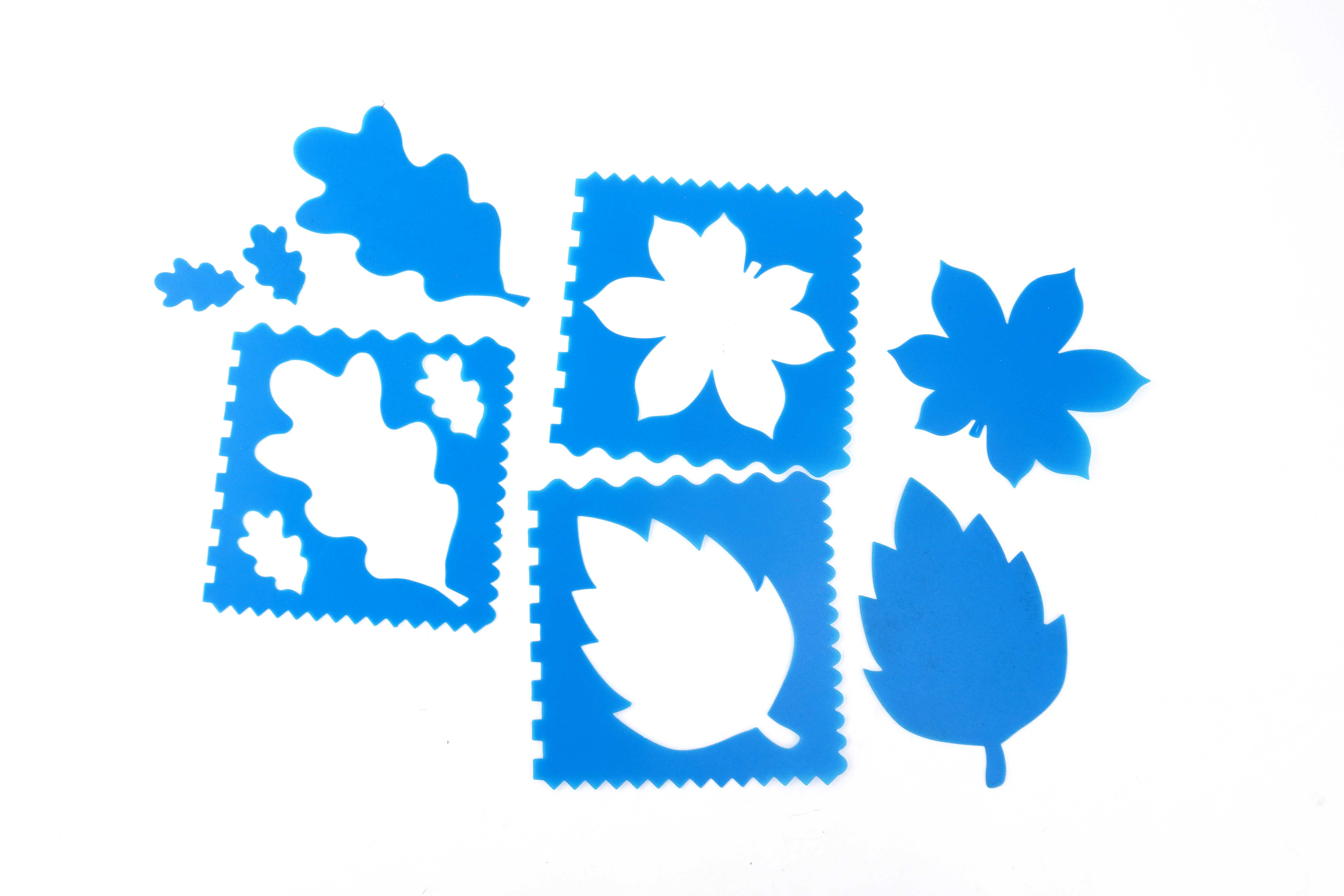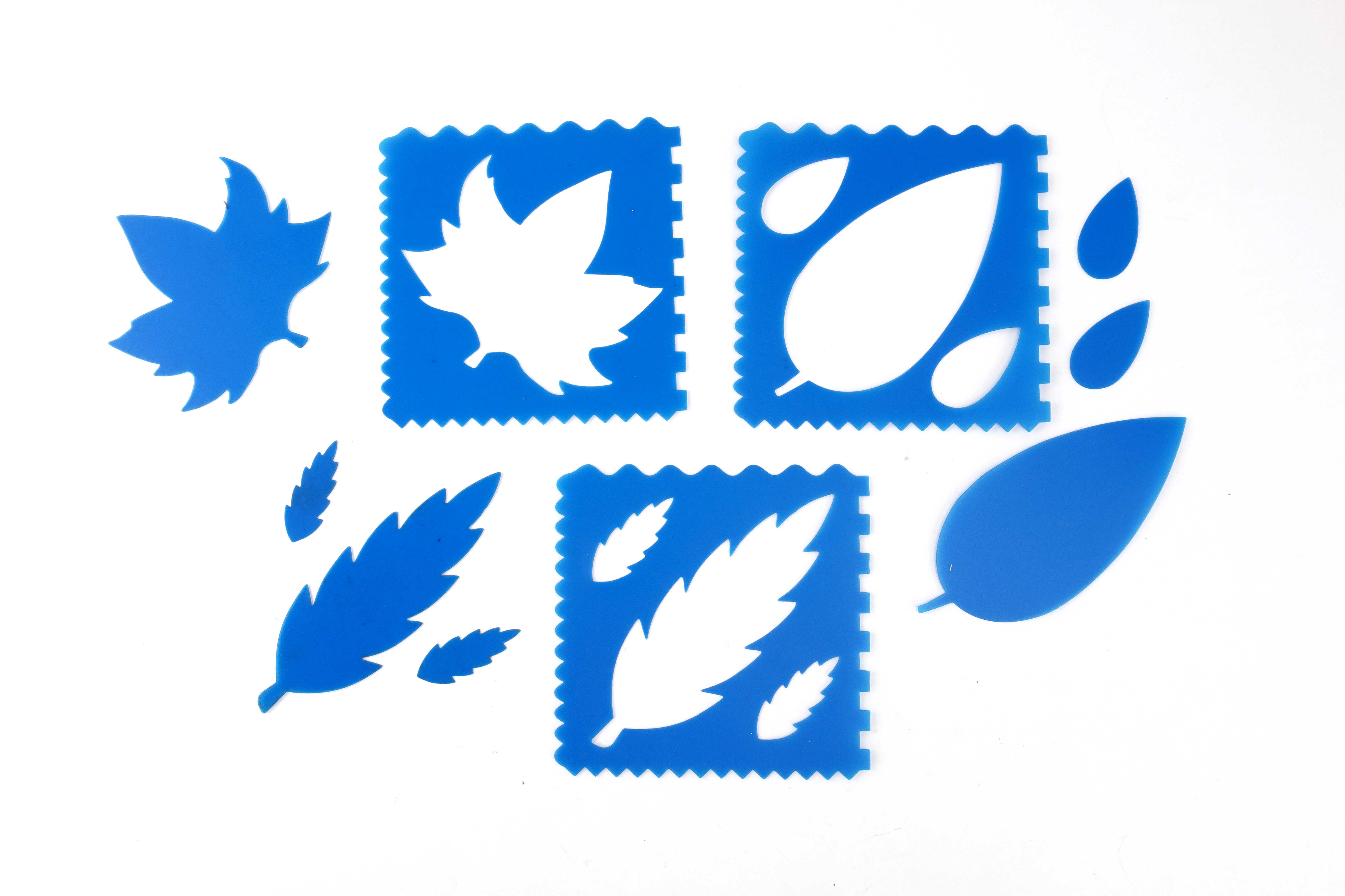 Set de 6 plantillas de plástico resistentes con motivos de hojas, perfectas para aprender a dibujar fácilmente.