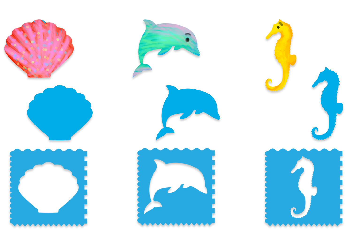 Plantillas de plástico resistente sobre el tema de los animales del mar, perfectas para aprender a dibujar fácilmente. Encuentra aquí delfín, caballito de mar, cangrejo, pez, estrella de mar y concha para realizar hermosas pinturas y dibujos.
