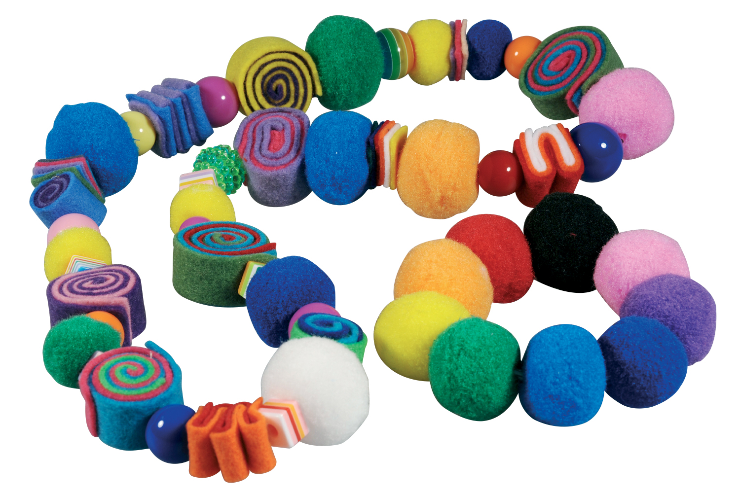 Para fabricar fácilmente hermosas pulseras y collares con estos pompones cuentas, usa hilo nylon, un cordón de algodón o una chenilla.