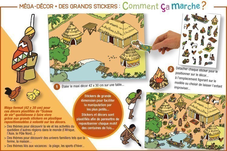 Decoración mega formato (42 x 30 cm) en cartón plastificado a animar gracias a los grandes stickers en film plástico reposicionable a voluntad sobre los decorados...