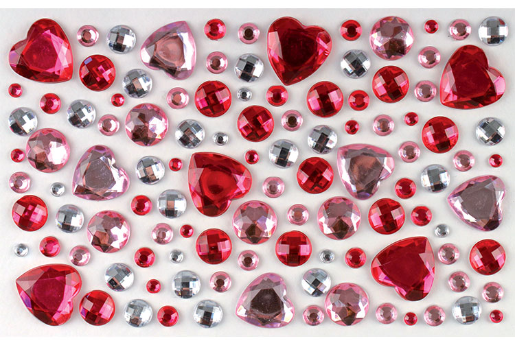 Strass brillantes autoadhesivos, en forma de corazón y de círculos. Prácticos, ya que están listos para usar, sin necesidad de pegamento.