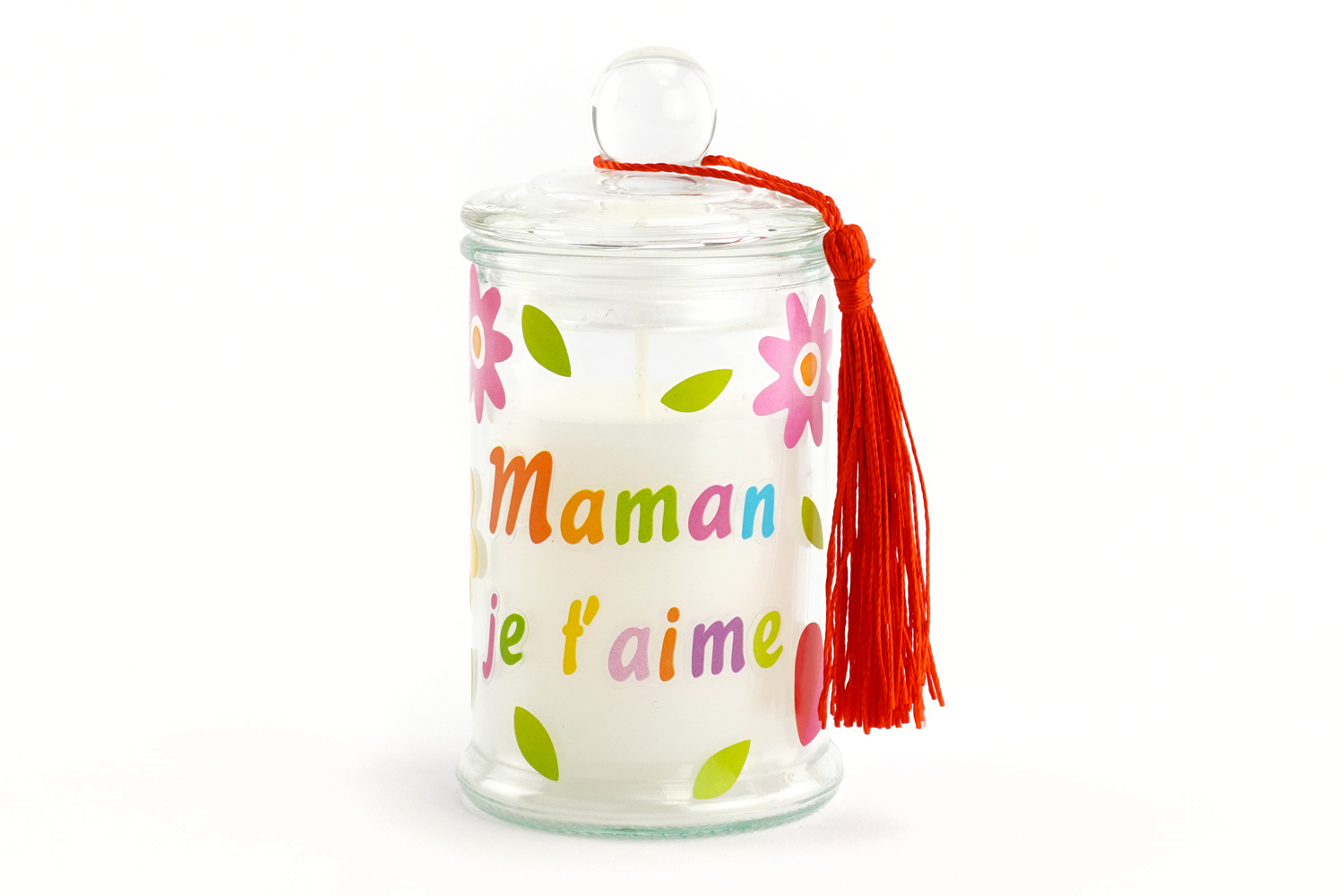 Con una combustión de aproximadamente 8 horas, esta vela también se convierte en un bonito regalo personalizado para decir « gracias », « te amo » o simplemente para hacer feliz a alguien. Se puede decorar con gomets, pegatinas o marcadores para vidrio: una actividad ideal para los niños.